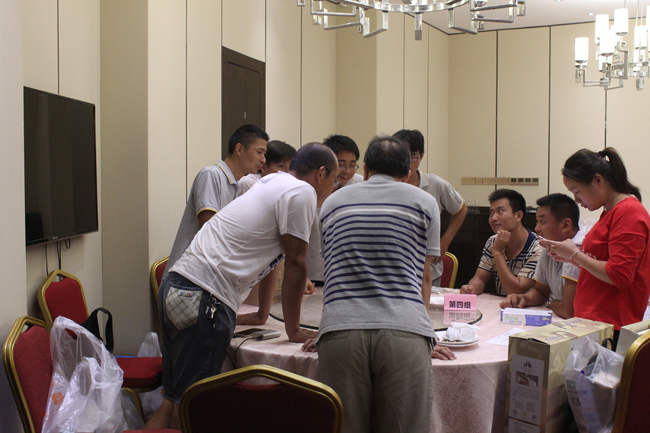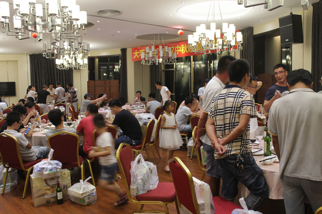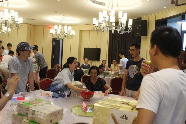 晚宴開始前,大手公司總經理馬總做了精彩的致辭 晚宴在一片歡快、幸福中度過。宴結束后,大家提著大包小包戰利品離開,彼此的臉上都期盼著對公司來年的更精彩的博餅活動。