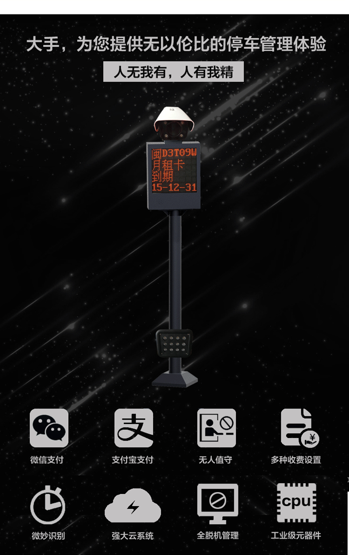 全脫機云支付車牌識別收費管理系統(tǒng)是大手控制全新推出的一款經(jīng)濟型車牌識別收費管理系統(tǒng),通過車牌識別對出入口車輛進(jìn)行快速識別判斷(包括車輛進(jìn)出場權(quán)限、車輛停車時間以及車輛應(yīng)繳費用等),以實現(xiàn)車輛秒進(jìn)/秒出停車場。系統(tǒng)以車牌識別率高、性能穩(wěn)定、功能實用、操作及施工簡單為設(shè)計思路,真正實現(xiàn)全脫機管理臨時車輛的獨有功能,極具性價比。